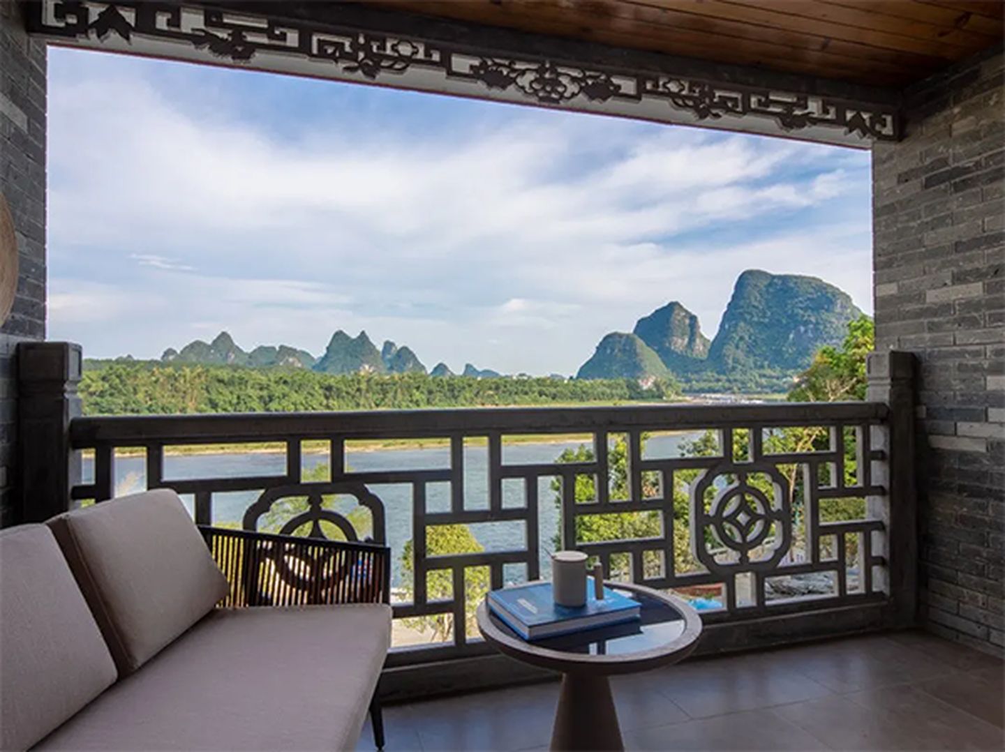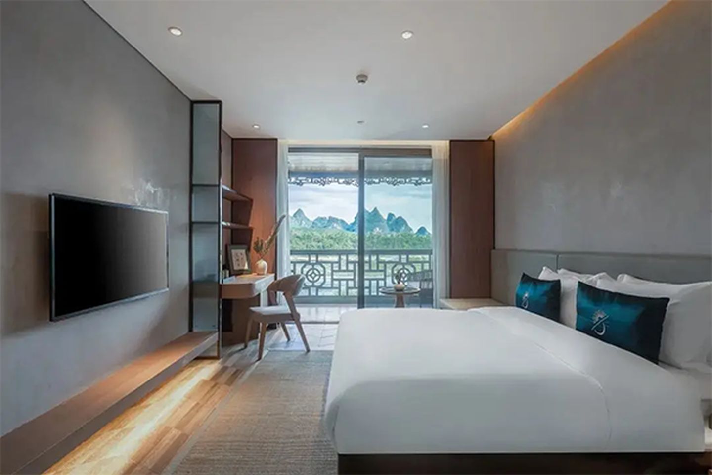 客房简素又不失温暖触感的风格,营造舒适以及不被打扰的私密感,让每天最幸福的一件事,就是在结束繁忙的一天后,沉入宽阔大床彻底放松,享受最深沉甜美的睡眠。江景阳台推窗即见漓江,山水映入眼帘,让你睡在山水间。